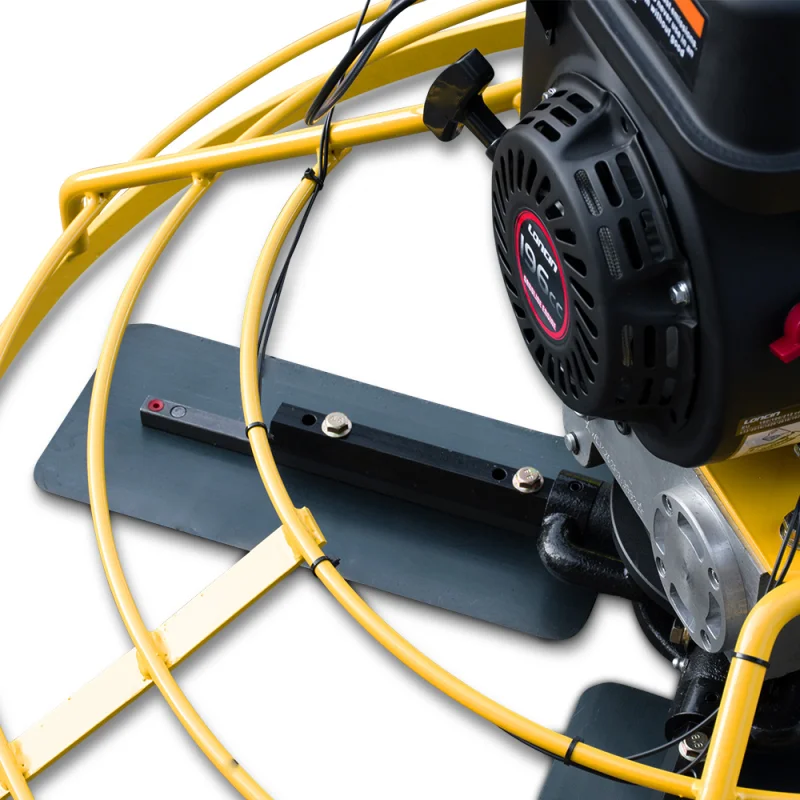 Za dodatnu sigurnost, glerica za beton opremljena je sigurnosnim prekidačem “deadman” koji automatski isključuje motor kada se ručka pusti. Čvrsti zaštitni okvir štiti ne samo stroj, već i operatera od slučajnog kontakta s rotirajućim oštricama.