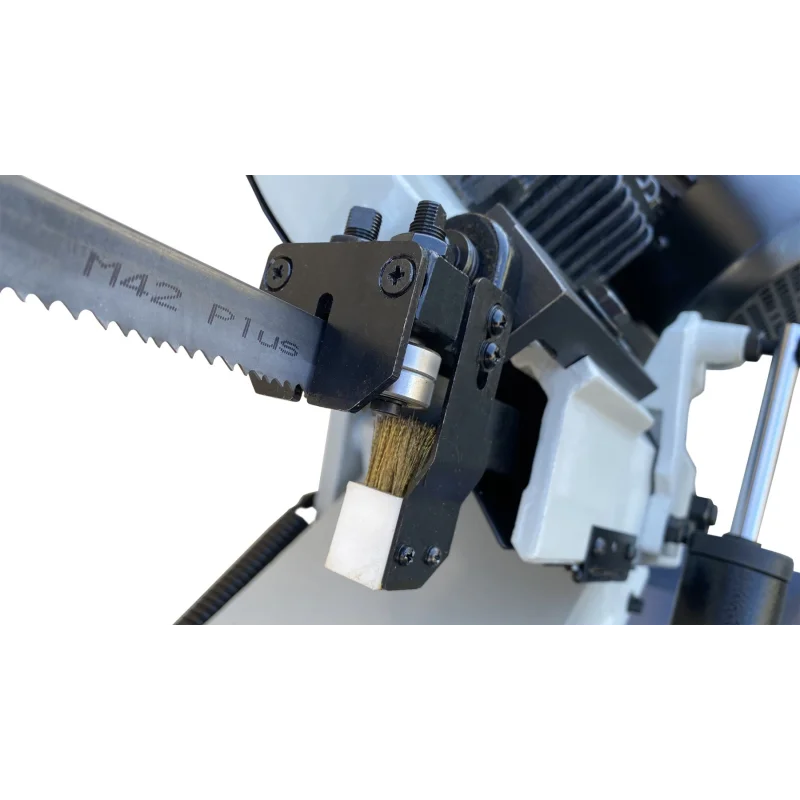 Dodatno, naš model stroja za razliku od konkurencije opremljen je žičanom četkom koja čisti reznu traku od strugotina - to sprječava začepljenje lista pile i omogućuje učinkovitije rezanje.