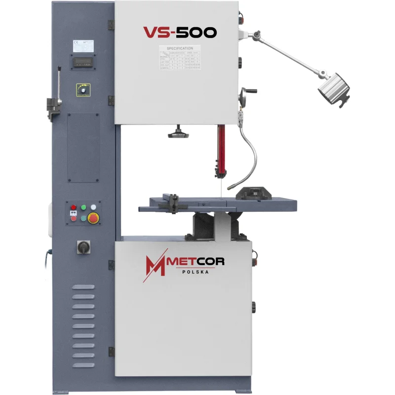 Pionowa tračna pila Metcor VS500Mnoge funkcije u jednoj mašini!SOLIDNA, POUZDANA PIONOWA PILA ZA METAL Sa stolom za rezanje pod kutom R-30°, L-15°Vertikalne tračne pile serije VS prikladne su za rezanje svih mogućih materijala.