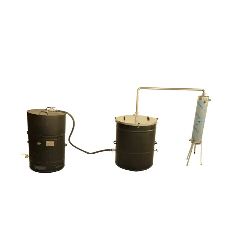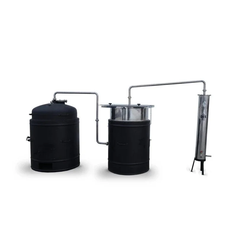 Kotao za destilaciju eteričnih ulja. Uređaj se sastoji od kotla za vodu zapremine 255 L, kotla u koji se stavlja bilje koje se planira destilirati zapremine 275 L, spojne cijevi i PH30 L protočni inox hladnjak.