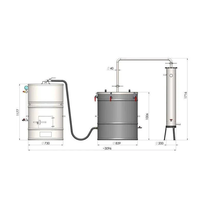 Donji kotao zapremine 255L se puni vodom do 50% kapaciteta točnije 125 L, kako bi između vode i gornjeg kotla gdje se bilje nalazilo ostalo min 1500mm prostora gdje se para stvara i odlazi gore u kotao sa biljem.