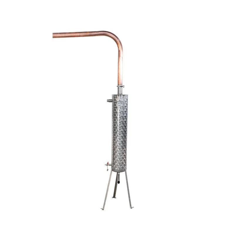 Plašt protočnog hladnjaka je sastavljen od vodootpornog inox lima debljine 0,8 mm, dok su parovodne cijevi kojih ima 18 kom promjera Ø 10x 1mm i komore koje iste povezuju napravljene od kiselootpornog inoxa predviđenog za upotrebu u prehrambenoj industriji Inox 304 (AISI). Hladnjak funkcionira na osnovu konstantnog protoka vode koja cirkulira između parovodnih cijevi. Iste cijevi povezuju dvije komore gdje se u gornjoj komori sakuplja destilat u parnom stanju te prolazeći kroz ohlađene parovodne cijevi kondenzira i dolazi do donje komore za skupljanje u tekućem stanju ohlađena na preporučenu temperaturu do 18 ° C.