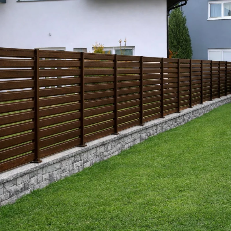 Modularna panel ograda izrađena je od obloženog čelika prekrivenog slojem cinka. Svaka letvica/panel premazana je posebnim zaštitnim i dekorativnim slojem u imitaciji različite vrste drveća ili različite boje.