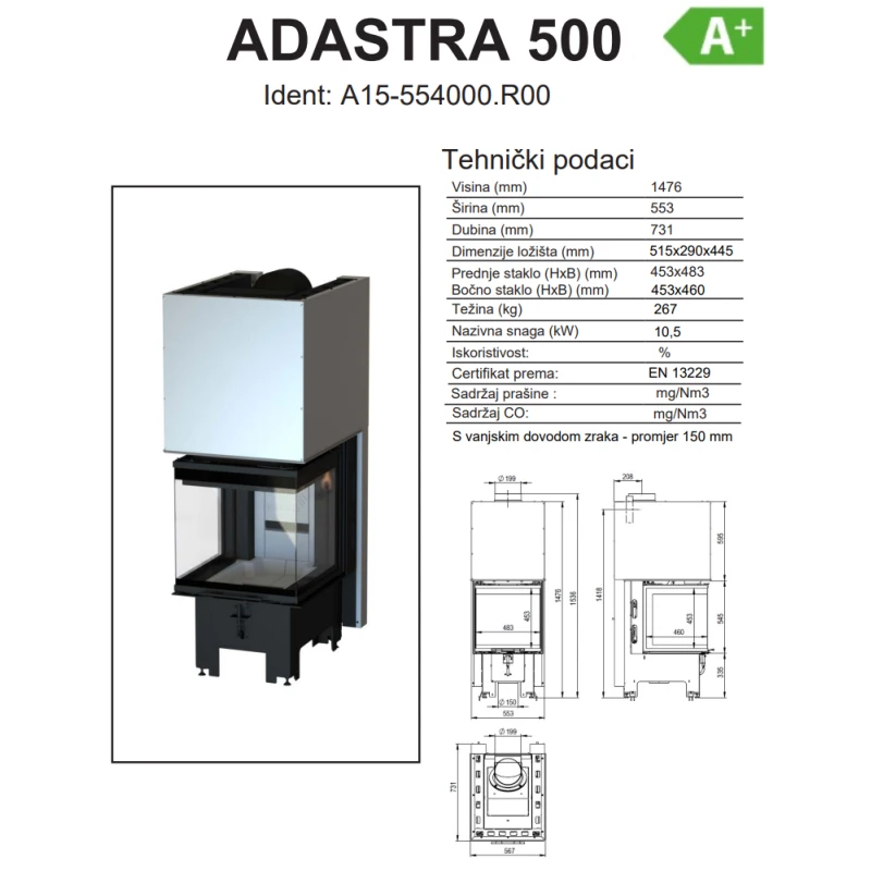 Visoko kvalitetna kaminska peć Thermia Adastra 500 sa snagom od 10,5 kW, trodjelnim staklom i kliznim mehanizmom na vratima.